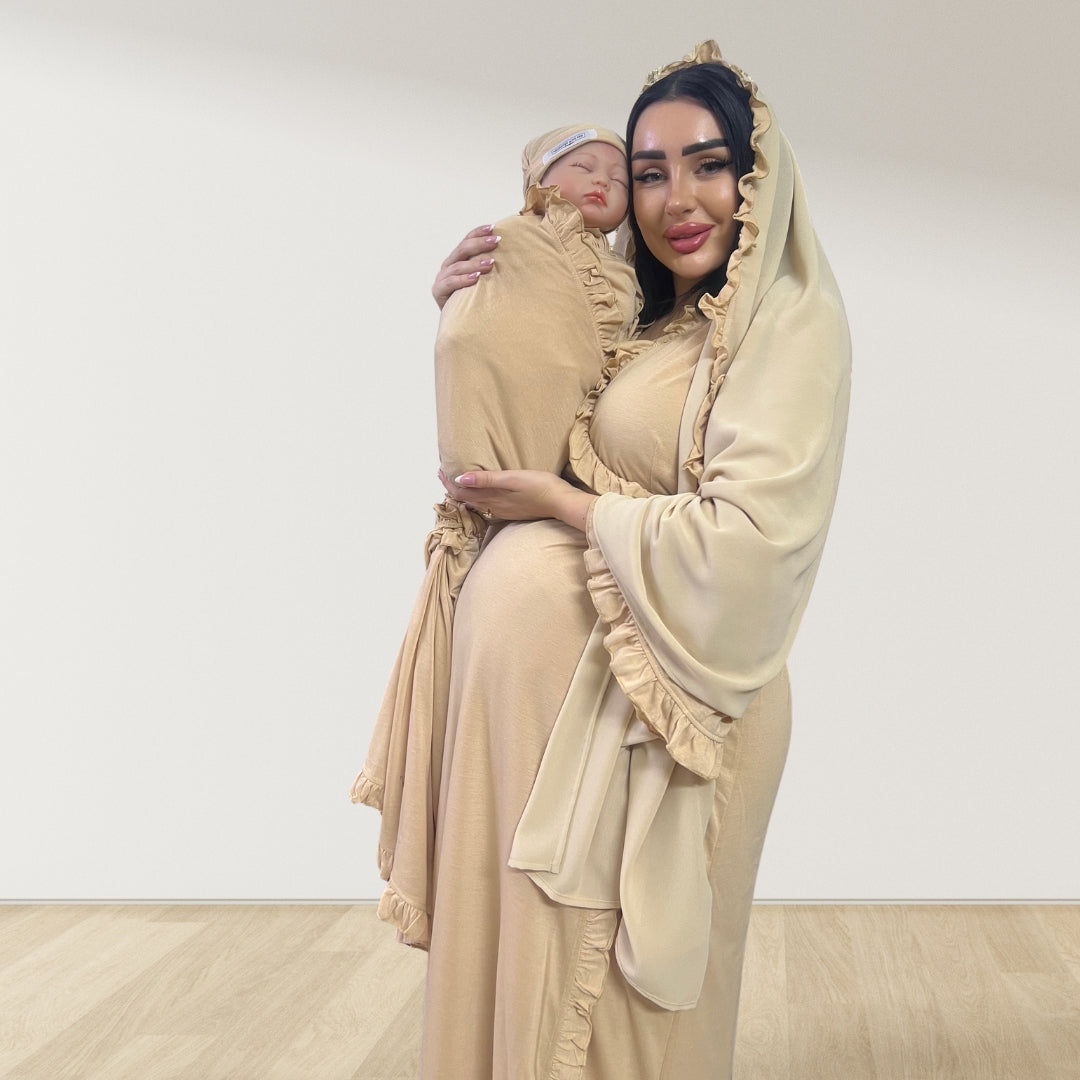 Mommy and Me matching maternity ruffled frills robe and swaddle set.